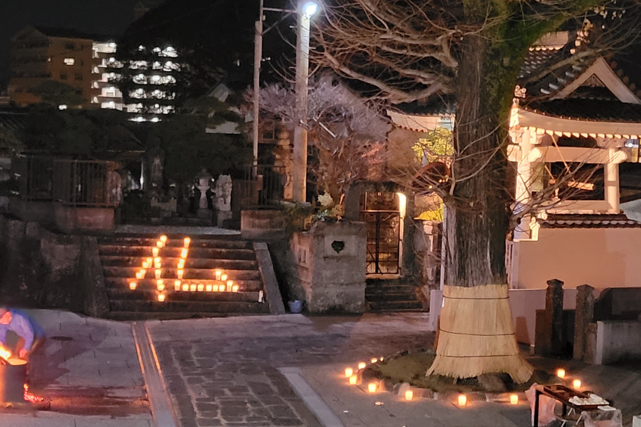 恒例となった光源寺のキャンドル文字。本堂で参拝を済まし、鐘楼堂の方を振り向くと境内に「仏」の文字が浮かび上がっています。